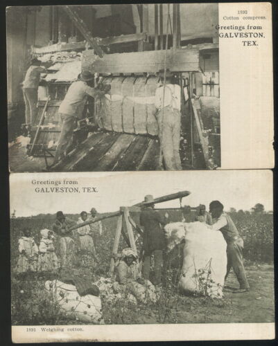 Title (ebay affiliate link): PAIR EARLY SEPIA PHOTO PC, GREETINGS FROM GALVESTON, TX BLACK COTTON WORKERS