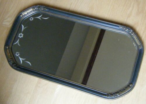 Antique vintage reverse etched wood & black gold gesso wall mirror 21.5 x 11.5