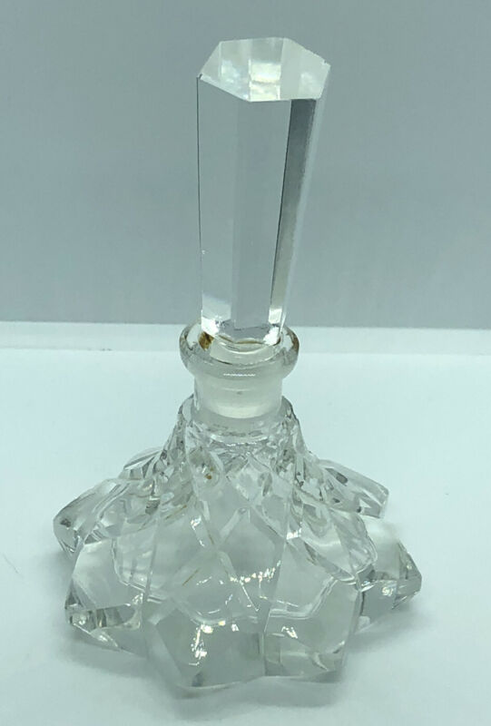 Title (ebay affiliate link): Vintage Art Deco czechoslovakia Clear Glass Perfume Bottle Chips On Topper