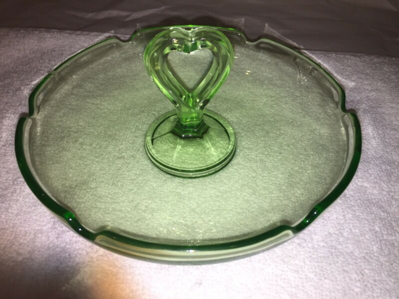 Vintage Vaseline Glass ( Green Uranium) Candy Dish with Heart Handle-6 inch