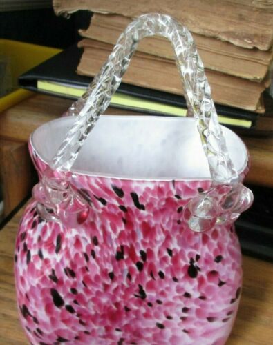 Title (ebay affiliate link): Pink Speckled Hand Blown Art Glass Handled Basket Handbag Purse EUC
