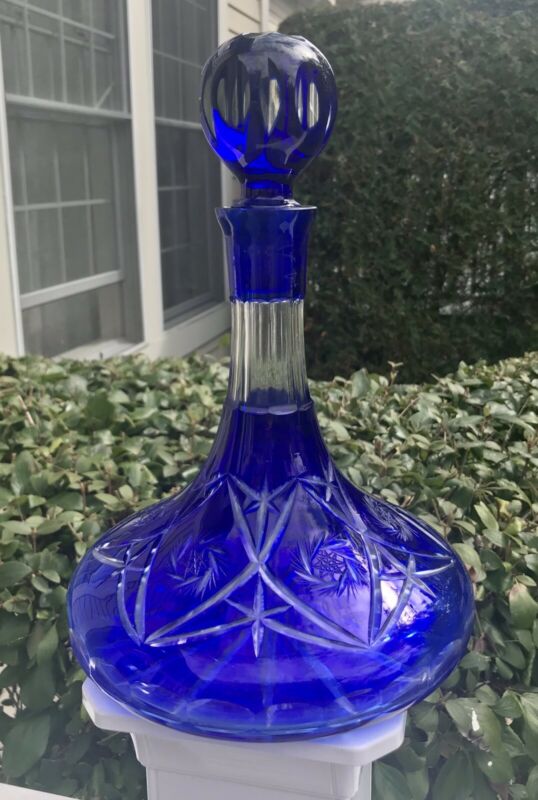 Vtg Cobalt Blue Cut to Clear Crystal Ships Decanter