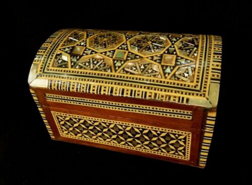 Title (ebay affiliate link): Egypt hand-made Ornate wood MOP & bone Inlay 4" Miniature trunk hinged domed Box