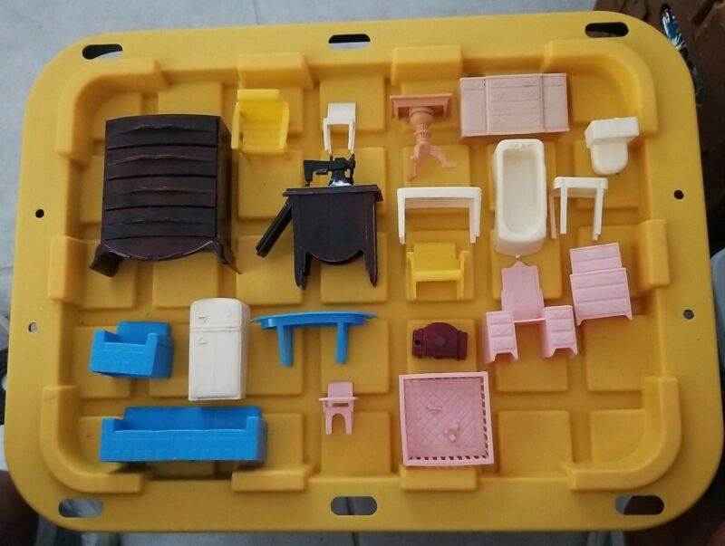 Title (ebay affiliate link): 20 VINTAGE Plastic Dollhouse FURNITURE RENWAL, MARX, PLASCO COLORFUL TV Sewing