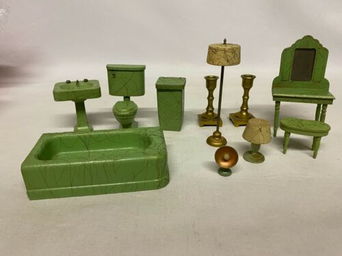 ANTIQUE GREEN DOLL HOUSE FURNITURE LOT 1930S-1950S STYLE