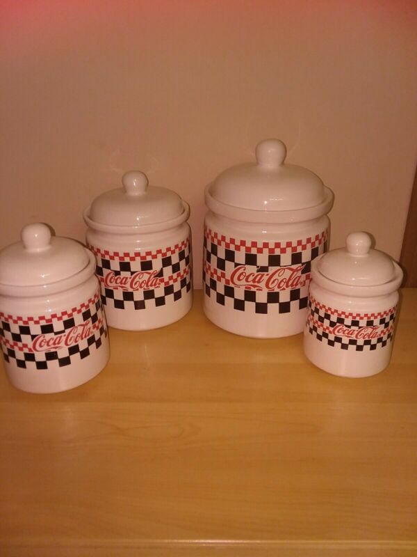 Title (ebay affiliate link): COCA COLA Canister Set w/ Lids Checkerboard Coke Design by GIBSON 4 Pieces 1997.