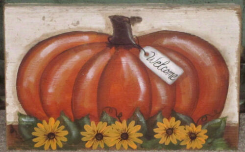 *~*PRIMITIVE*~* HP FOLK ART PRIM PUMPKIN * SUNFLOWERS * WELCOME * RECLAIMED WOOD