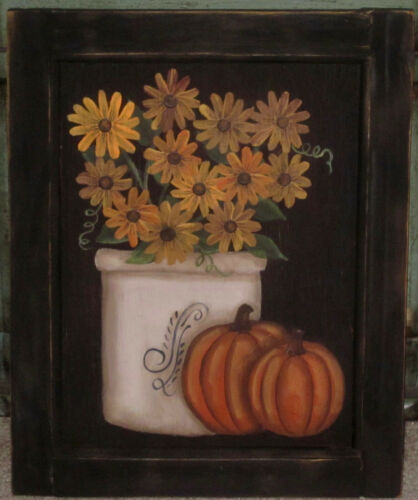 *~*PRIMITIVE*~* HP FOLK ART PRIM CROCK * SUNFLOWERS * PUMPKINS *~* DOOR PANEL