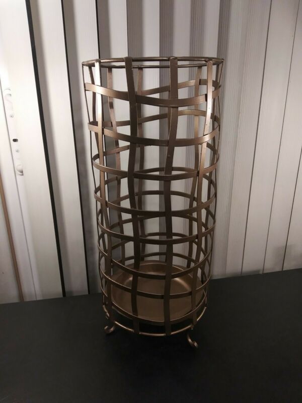 Title (ebay affiliate link): Unique Vintage Gold Woven Iron Umbrella/Cane Stand with Drip Tray