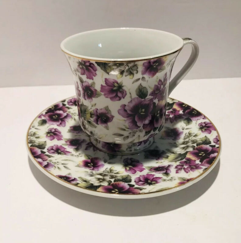 Darice Chintz Teacup & Saucer Set Purple Pansies Flowers Holds 8oz