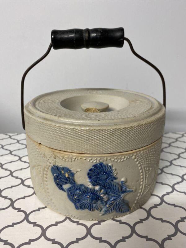 Unique COWS BUTTER CROCK W/ LID Handle ANTIQUE Flow BLUE STONEWARE