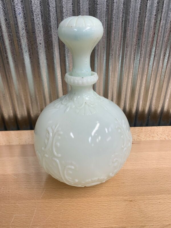 Title (ebay affiliate link): Vintage White/Blue Milk Glass Round Decanter Vase French Scroll Raised Design