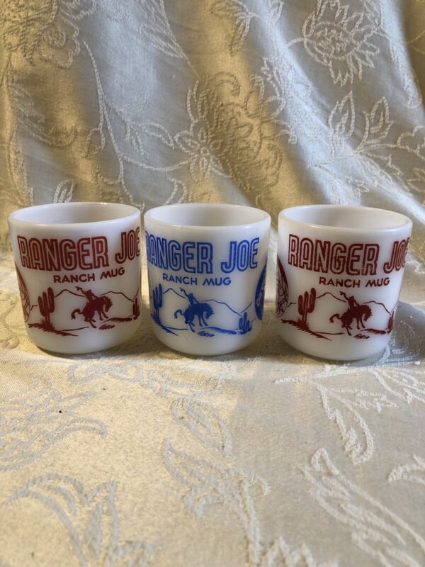 Ranger Joe Ranch Mug Vintage Hazel Atlas Milk Glass Childs Mug 2 Red 1 Blue