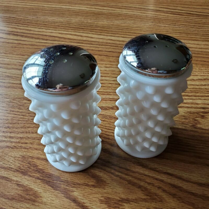 Title (ebay affiliate link): Fenton Hobnail Milk Glass Salt & Pepper Shakers. Vintage in Excellent Condition.