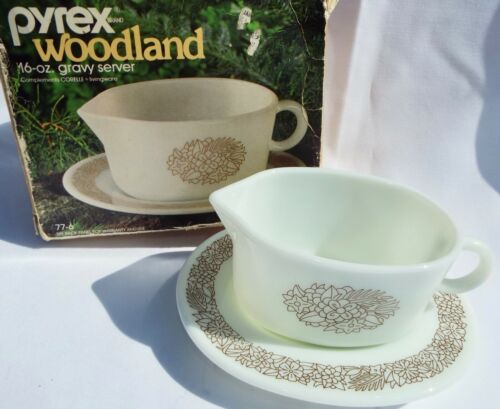 Title (ebay affiliate link): NIB PYREX CORNING GRAVY BOAT PITCHER AND 77-6 UNDER PLATE DISH WOODLAND 16 oz.