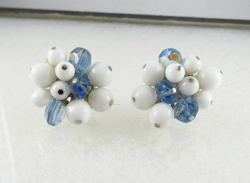 Vintage Vendome Milk Glass Blue Crystal Earrings Clusters