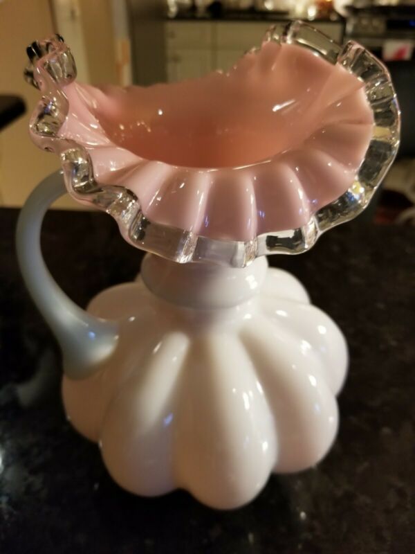 Title (ebay affiliate link): Vtg Fenton White/Pink Milk Glass Ruffled Edge Melon Vase/Pitcher with Handle