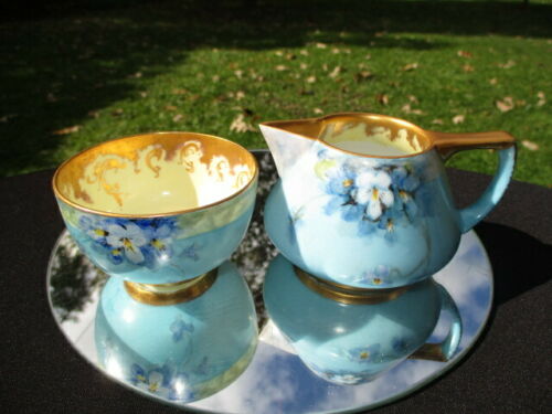 ANTIQUE CREAM & SUGAR BOWL ARTIST WARE SAPPHIRE BLUE FIELD VIOLETS lots of GOLD