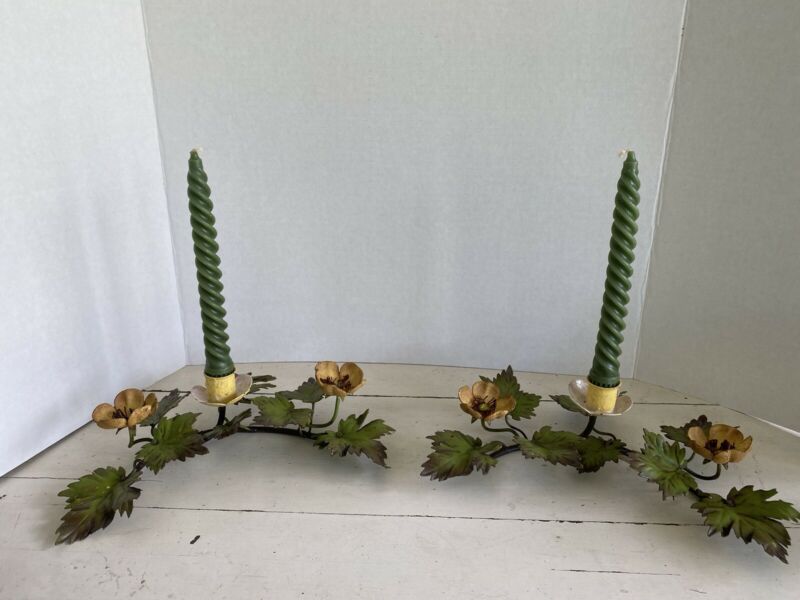 Vintage Toleware Candleholders Matching Pair Primrose Flowers