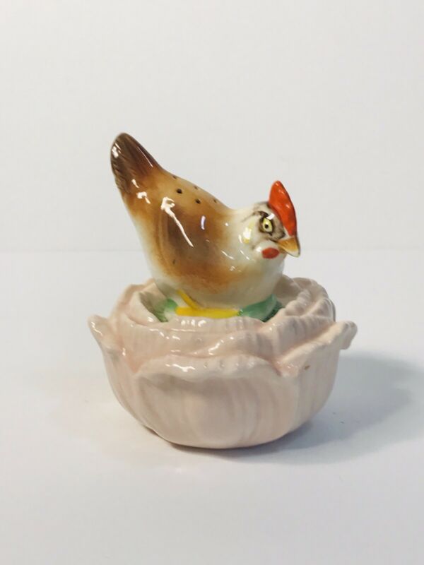 Vintage Rooster Hen Chicken On Cabbage Head Ceramic Salt And Pepper Shakers