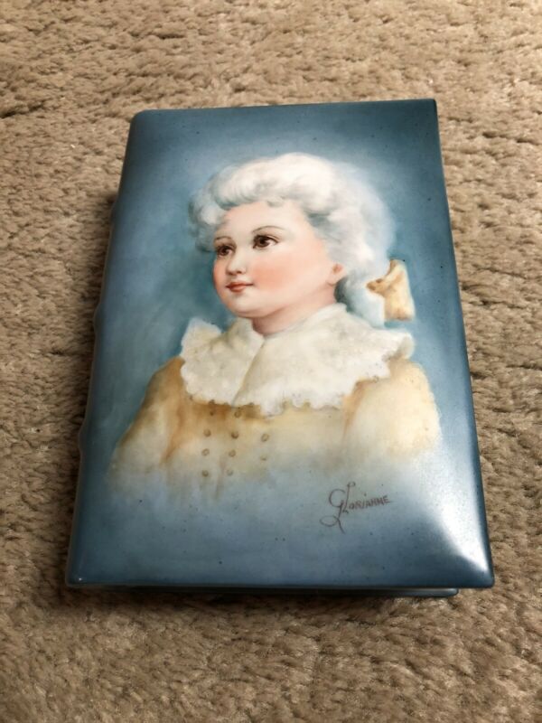 Title (ebay affiliate link): Antique Hand Painted Porcelain Trinket Jewelry Box Shaped Like A Book
