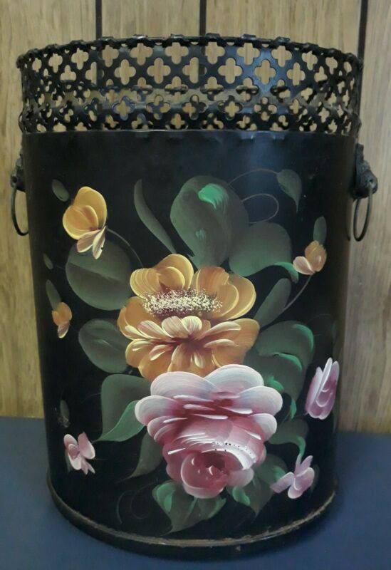 Title (ebay affiliate link): Vintage Shabby Hand Painted Black Metal Tole Waste Basket Floral, Lion Head