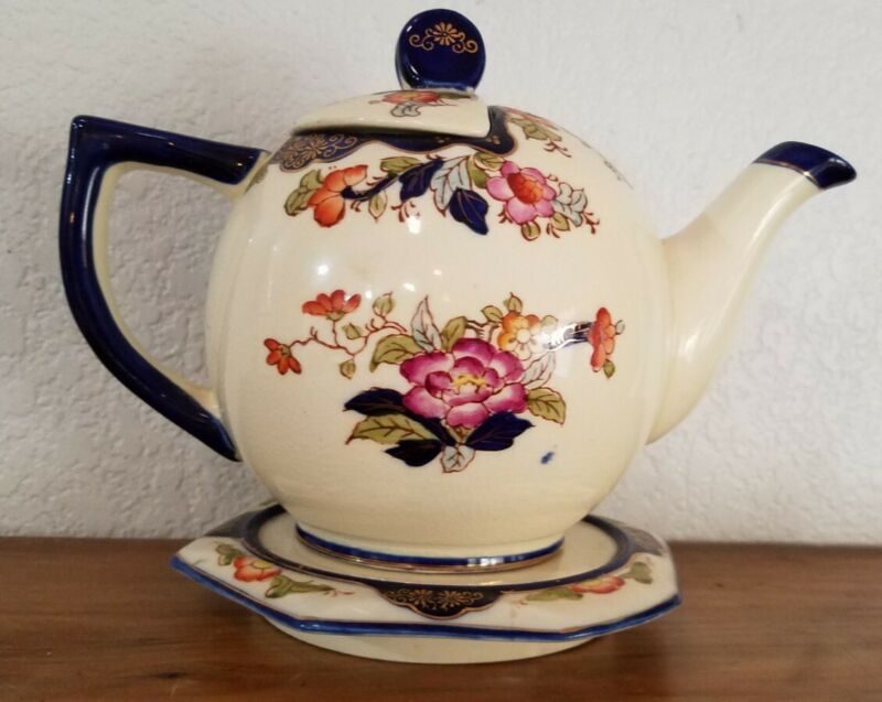 Moriyama MM Teapot & Trivet - Cobalt Blue & White - Orange & Pink Floral Accents