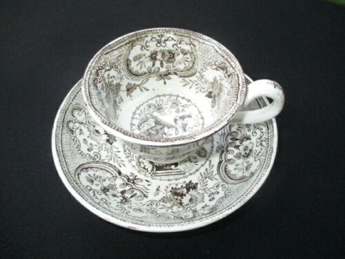 CUP SAUCER VICTORIAN PASTE BROWN TRANSFERWARE PEACK AT THE FOUNTAIN DEMITASSE