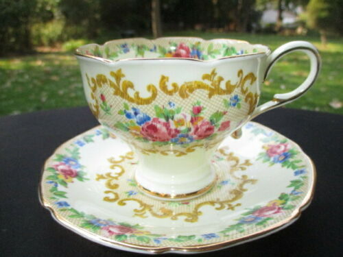 CUP SAUCER PARAGON CORSET SHAPED MINUET DOUBLE WARRANT PINK ROSES IN BOUQUETS
