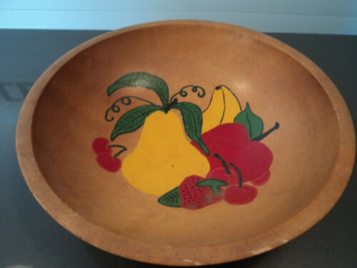 Title (ebay affiliate link): ANTIQUE PRIMITIVE MARKED*MUNISING* FARMHOUSE KITCHEN WOOD BOWL*FRUIT DESIGN*