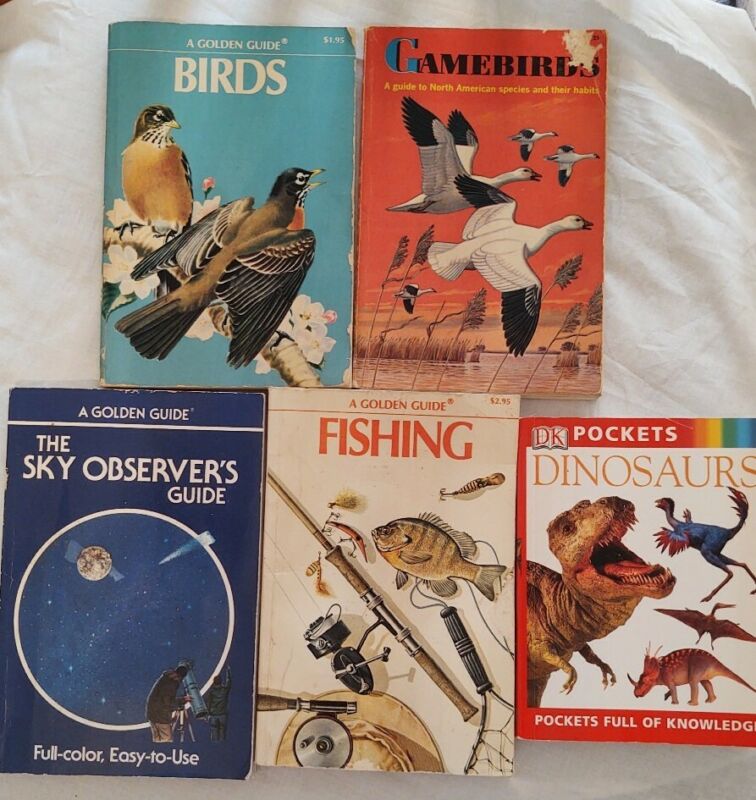 Title (ebay affiliate link): 5 Lot: 4 Golden Guide Books Bird, Sky, Gamebird, Fishing 1 DK Pocket Bk Dinosaur