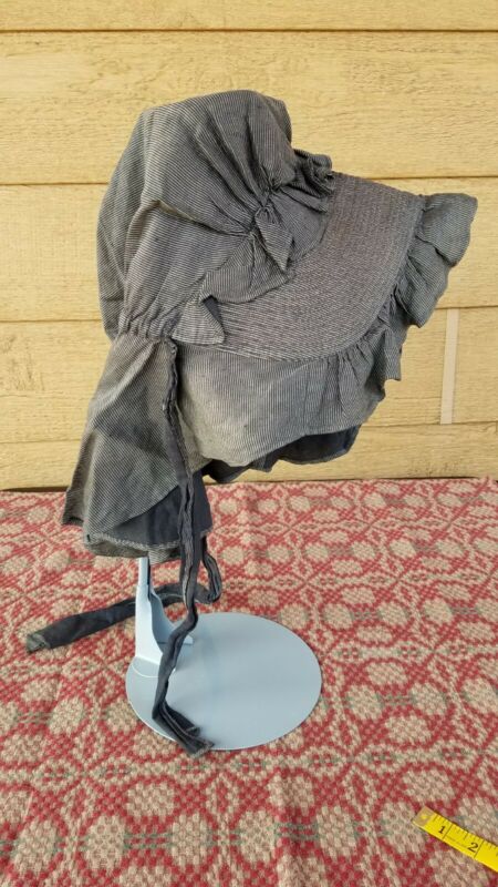 Title (ebay affiliate link): Antique EARLY PRIMITIVE Black Striped Ruffled PRAIRIE BONNET TEXTILE ~ Nice!