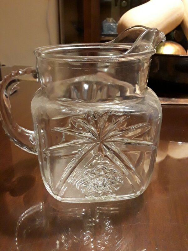 Title (ebay affiliate link): Milk Pitcher VTG Federal Glass? Square Star Starburst & Flower Ribbed Handle