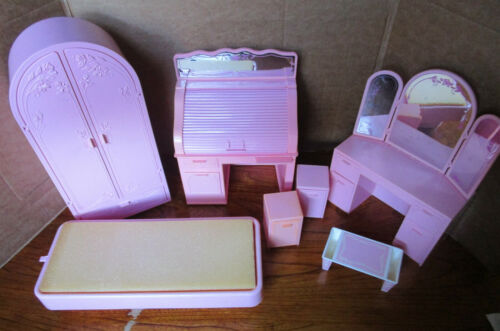 Title (ebay affiliate link): Barbie Bedroom Furniture Sweet Roses Vanity Rolltop Desk Bed Night Stands Armoir