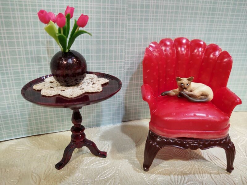 Renwal LADIES CHAIR RED w/ Ideal TABLE Vintage Miniature Tin Dollhouse Furniture