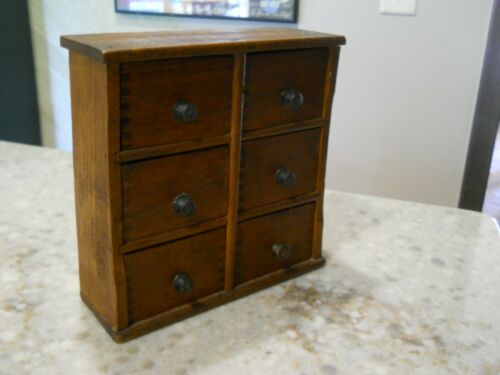 Title (ebay affiliate link): SMALL ANTIQUE WOOD CABINET 6 TINY DOVETAIL DRAWERS TRINKETS JEWELRY TABLE TOP