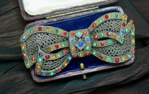 Fabulous Vintage Antique Art Deco Multi-Coloured Rhinestone Bow Brooch Pin Czech