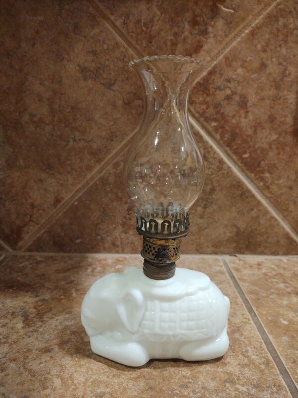 Title (ebay affiliate link): Antique Milk Glass Miniature Oil Lamp Kneeling Elephant W/ Original Chimney