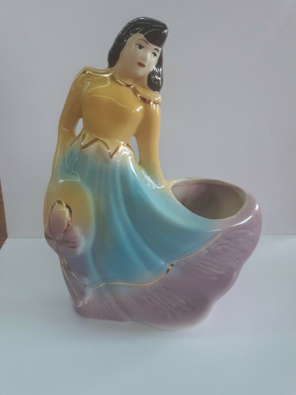 Title (ebay affiliate link): Vintage Lady/woman Planter brown hair with yellow blue and purple dress