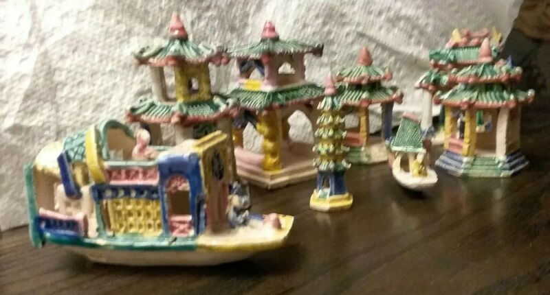 Title (ebay affiliate link): Lot Vintage Japanese clay Garden Miniature Figurines Temple Pagoda Hut