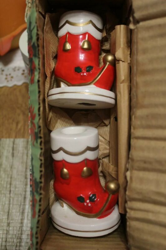 Napco X 5077 Christmas Elf Santa Boot Candle Holders Turned Up Toe Gold Ball
