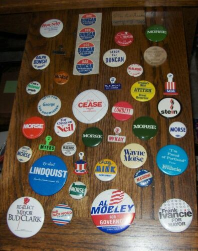 Title (ebay affiliate link): 42 Vintage OREGON Pin Button Metal Tab, Stickers, Stamp, Nickel Campaign Lot