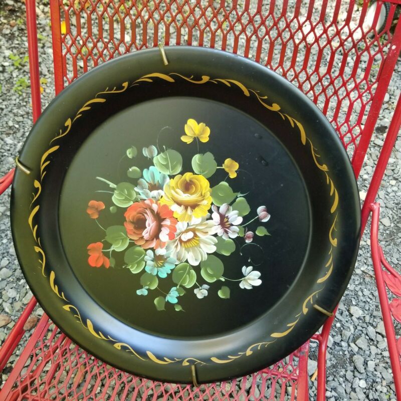 Title (ebay affiliate link): Vintage Tole Metal Round Serving Tray Hand Painted Floral 20" w/hanger