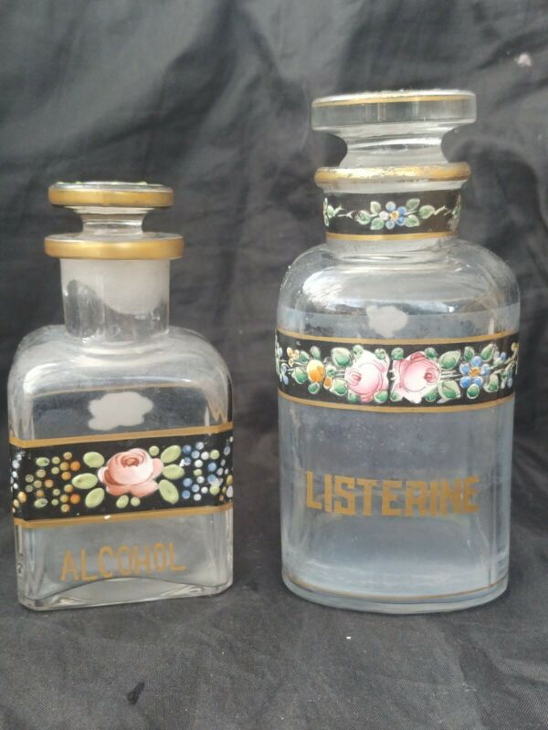 Title (ebay affiliate link): Antique Enameled Glass Apothecary Bottles for Listerine and Alcohol