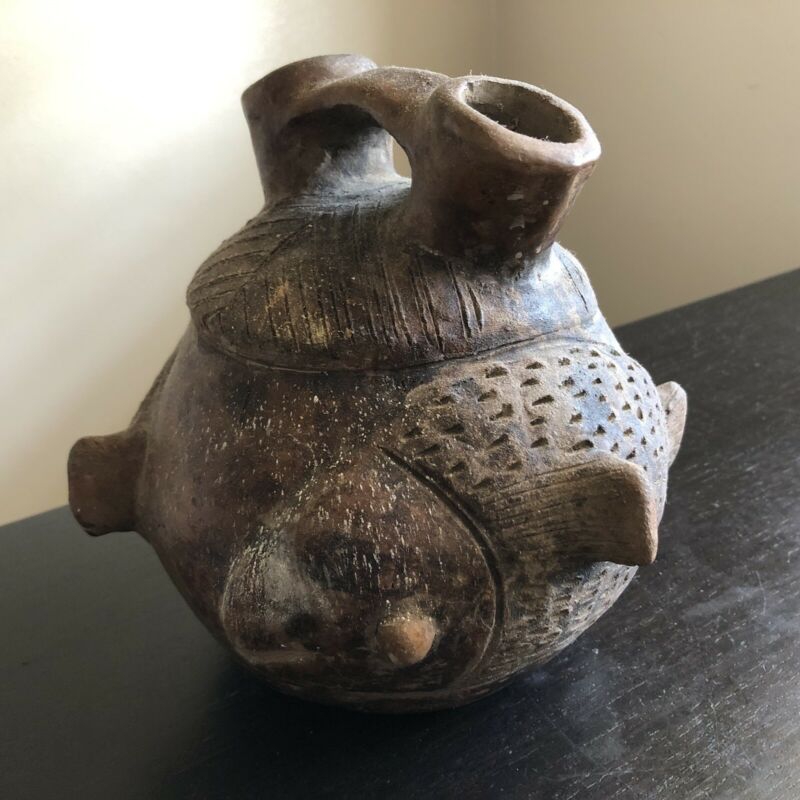 Title (ebay affiliate link): Antique Pre Columbian Moche Chimu Pottery Stirrup Vessel Double Spout & Fish Art