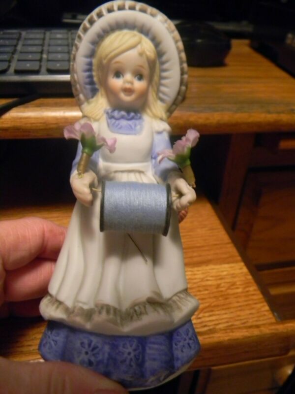 Price Product Porcelain Blue Seamstress Girl Figurine Sewing Thread Spool Holder