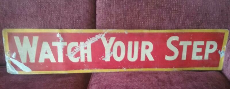 Vintage metal WATCH YOUR STEP sign 36" x 7"
