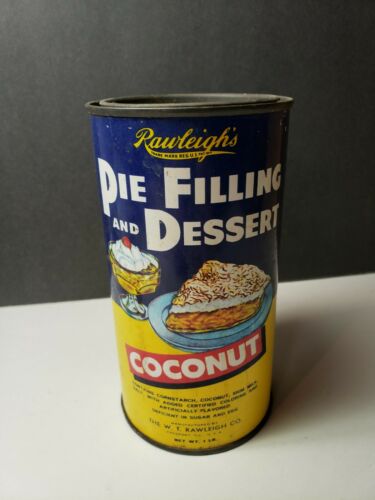 Title (ebay affiliate link): VINTAGE RAWLEIGHS COCONUT PIE FILL ADVERTISING TIN GREAT COLORS
