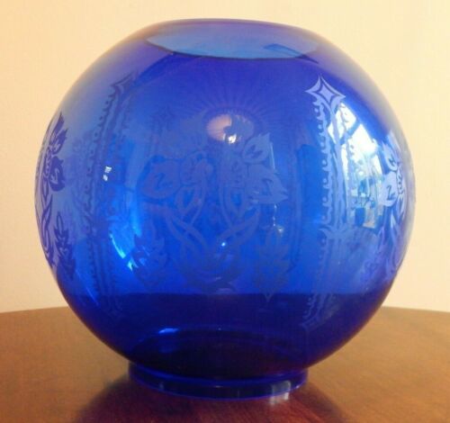 Duplex 4" Fitting Glass Oil Lamp Shade - Cobalt Blue Etched Globe