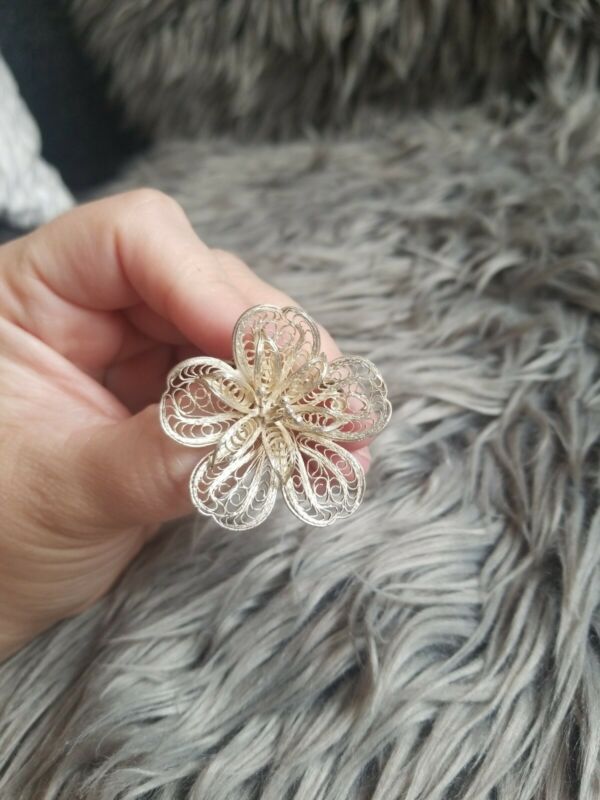 Title (ebay affiliate link): Antique Silvertone Filigree Fret Work Flower Brooch Pin c- clasp